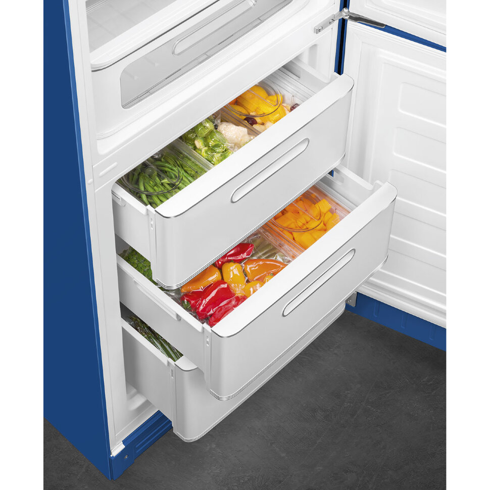Холодильник SMEG FAB32RBE5 предназначен для кратковременного хранения различных готовых блюд, охлаждённых продуктов и напитков, а также для заморозки и длительного хранения замороженных продуктов и полуфабрикатов. Полки изготовлены из закалённого стекла, благодаря чему выдерживают большую нагрузку. Полки на дверцах выполнены из пластика. Данная модель идеально подойдёт для авторских интерьеров в уникальном стиле или для кухонь в классическом исполнении.