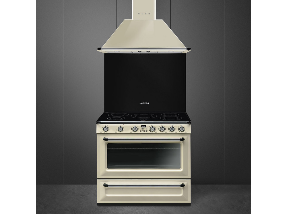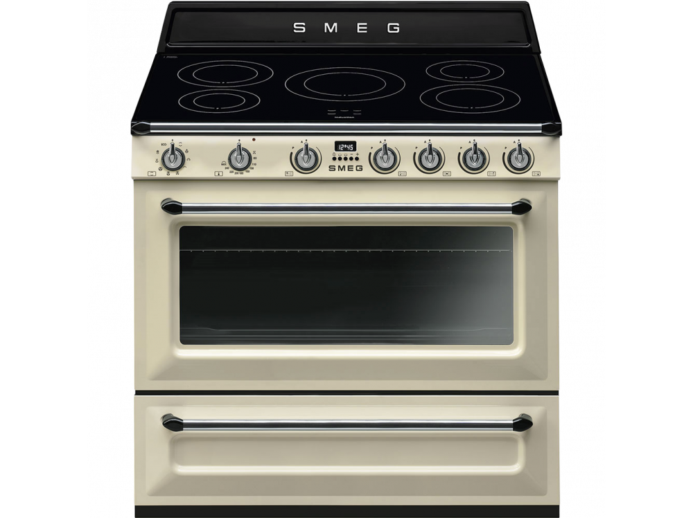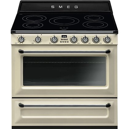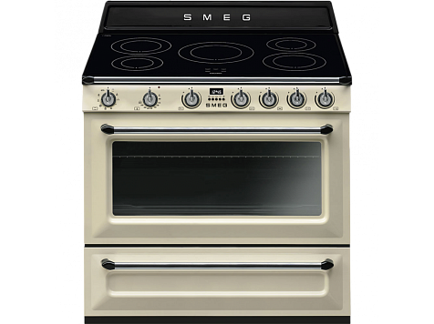 Smeg — многофункциональная плита с электрическим духовым шкафом и индукционной варочной поверхностью. Кремовый корпус модели с матовыми боковинами дополнен практичным выдвижным ящиком для хранения кухонных аксессуаров. Трехслойное остекление дверцы снижает риск получения ожогов. Кроме того, безопасность эксплуатации обеспечивается наличием системы автоматического отключения при перегреве.