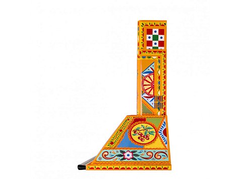 Взрыв ярких красок, полный повествовательного акцента: украшение этого кухонного прибора черпает вдохновение из мотивов традиционной сицилийской тележки, используемой странствующими торговцами цитрусовыми фруктами и десертами изо льда, которую можно найти в самых живописных уголках Сицилии. Формы и цвета воспевают поэтику этого образа, одного из самых узнаваемых фольклорных символов острова. Фронтальная часть украшена геометрическими, полихромными и ромбовидными мотивами, используемыми и в напольной плитке и стилизованными звездочками и цветами, которые отсылают к нежной весенней атмосфере. В центре корпуса вытяжки доминирует характерная для Сицилии опунция, по бокам изображены фрукты, внизу – фриз из растительных и цветочных мотивов. Декоративный орнамент продолжается до самого дымохода, гармонично завершая эту симфонию узоров и роскошных оттенков.